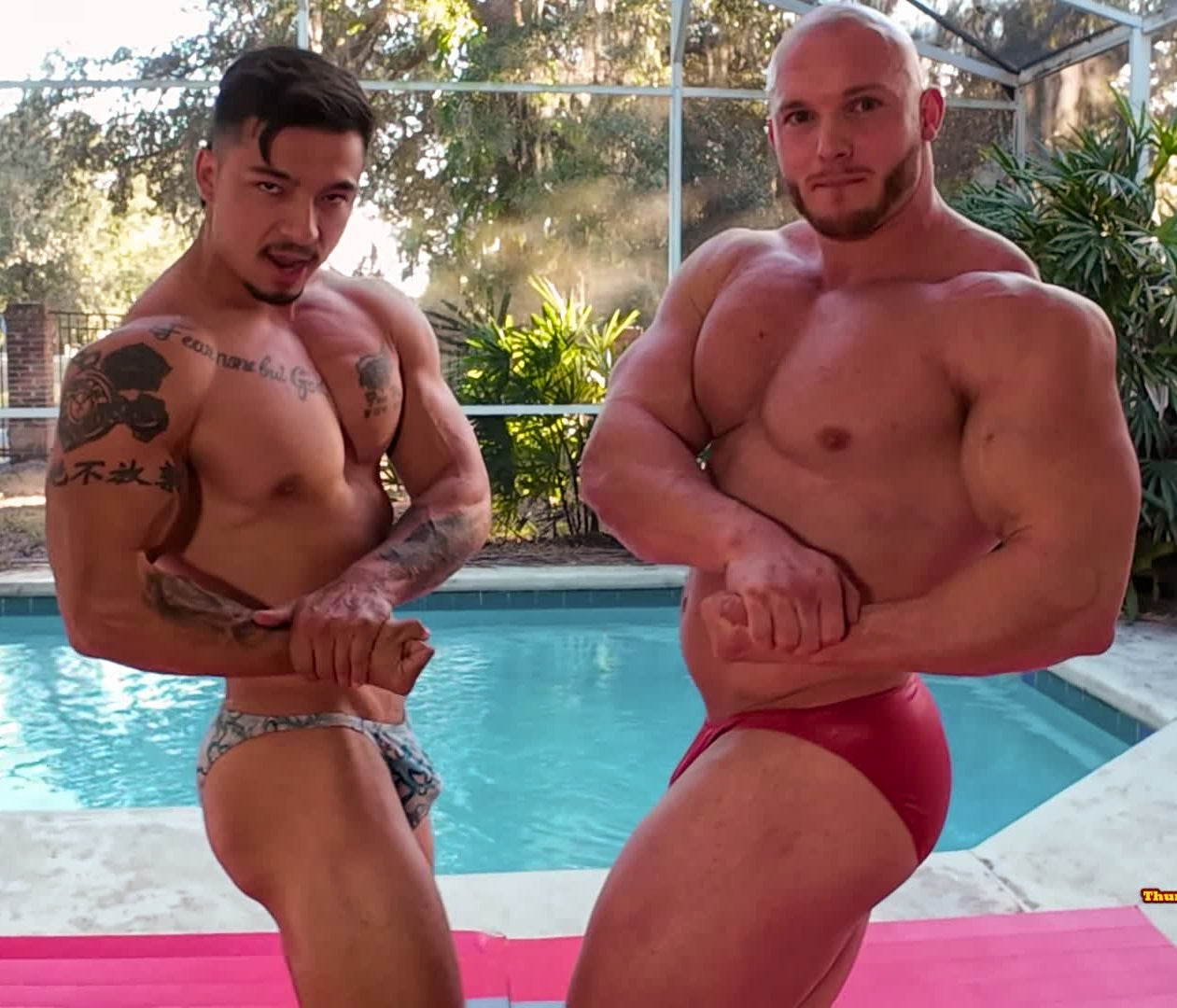 Bodybuilder sits on opponent Rear Full Nelson